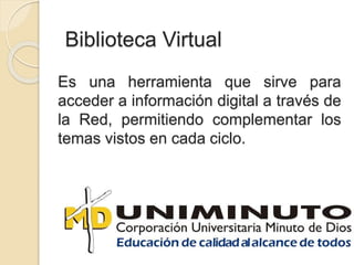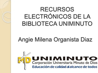 Este documento describe los recursos electrónicos disponibles en la biblioteca de la Universidad UNIMINUTO, incluyendo libros electrónicos, bases de datos, catálogos en línea y revistas académicas. Provee detalles sobre varias plataformas para encontrar libros electrónicos y enumera algunas bases de datos populares a las que los estudiantes tienen acceso.