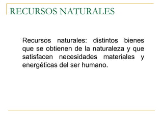 El documento detalla la clasificación de los recursos naturales en renovables, no renovables y potencialmente renovables, así como sus fuentes y usos en la generación de energía. Incluye información sobre propiedades de la energía, tipos de energía (como solar, eólica, hidráulica, y nuclear), y sus ventajas e inconvenientes. También se discuten centrales eléctricas y su funcionamiento, así como la importancia de la energía en la satisfacción de las necesidades humanas.