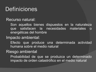 El documento clasifica los recursos naturales en no renovables, renovables e inagotables. Los recursos no renovables como el petróleo y el carbón no pueden reemplazarse a sí mismos, mientras que los recursos renovables como la energía eólica y geotérmica pueden reemplazarse naturalmente. Los recursos inagotables como la energía solar no se agotarán nunca.