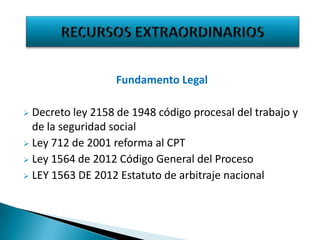 Este documento describe los fundamentos legales y aspectos clave del derecho procesal laboral en Colombia. Explica los recursos de casación, anulación y revisión, incluyendo sus causales, oportunidad, legitimación y trámite. También define el recurso extraordinario de casación como un mecanismo para asegurar la aplicación uniforme de la ley y proteger los derechos constitucionales. Finalmente, resume los requisitos y fines del recurso de arbitraje en conflictos laborales.