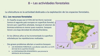 La superficie forestal ha crecido a 27 millones de hectáreas debido a la reforestación y el abandono de la actividad agropecuaria. Los problemas para la explotación forestal incluyen la deforestación, incendios y enfermedades, lo que hace necesaria una política forestal adecuada. La producción forestal representa el 2,7% del PFA, siendo el sector maderero el más significativo, aunque se requiere importar un 25% de la madera consumida.