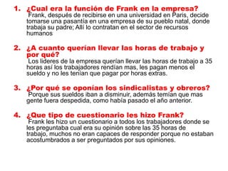 Frank trabajaba en el departamento de recursos humanos de una empresa. La dirección quería aumentar las horas de trabajo a 35 horas semanales para pagar menos sueldos y evitar horas extras, pero los sindicatos y obreros se oponían porque sus sueldos iba a disminuir y temían más despidos. Frank encuestó a los trabajadores sobre sus opiniones sobre la medida, aunque no estaban acostumbrados a ser consultados. La relación de Frank con su padre, también empleado, era débil debido a sus diferentes visiones sobre la empresa. Finalmente, los traba