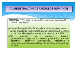 Este documento resume los conceptos clave de la administración de recursos humanos. Explica que la ARH involucra funciones directivas como la planeación, organización, dirección y control, así como funciones operativas como el desarrollo, remuneración, integración y mantenimiento de personal, con el objetivo de lograr los objetivos organizacionales. También describe los retos actuales que enfrentan los gerentes de recursos humanos, como la globalización, el cambio continuo, la tecnología y atraer y retener talento competente.