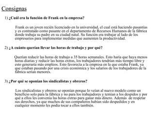 Frank es un pasante de recursos humanos cuya función era implementar medidas para aumentar la productividad, como reducir las horas de trabajo a 35 horas semanales. Los sindicalistas y obreros se opusieron porque temían que esto resultara en despidos. Frank hizo un cuestionario para ver la opinión de los trabajadores, y descubrió que su padre sería despedido. Esto creó tensión entre Frank y su padre ya que Frank pasó a apoyar a los obreros en huelgas.