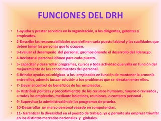 El documento describe las funciones y objetivos del departamento de recursos humanos de una organización. El departamento se encarga de la planeación, organización, selección, capacitación y retención del personal, así como de establecer políticas de compensación, beneficios y seguridad laboral. Sus objetivos principales son mejorar la productividad de los empleados y alinear los recursos humanos con las metas generales de la organización.