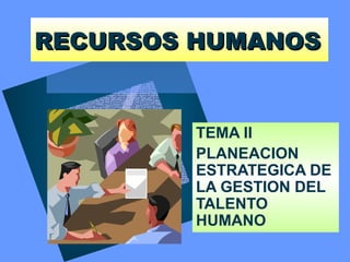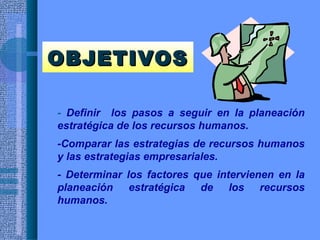 Este documento describe los pasos y factores involucrados en la planeación estratégica de recursos humanos. Explica que la planeación estratégica de recursos humanos implica definir con anticipación la fuerza laboral necesaria para alcanzar los objetivos organizacionales. También compara las estrategias de recursos humanos con las estrategias empresariales, y describe diferentes modelos para la planeación de recursos humanos, como uno basado en la demanda de producción u otro basado en el flujo de personal.