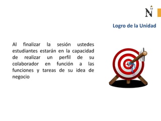 Este documento presenta información sobre la organización de recursos humanos para un plan de negocio. Explica los procesos de reclutamiento y selección de personal, capacitación y desarrollo, y niveles administrativos. También define conceptos clave como funciones, tareas, tipos de organización, poder y departamentalización. El objetivo es ayudar a los estudiantes a realizar un perfil de colaboradores según las funciones requeridas por su idea de negocio.