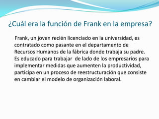 Frank es un pasante de recursos humanos cuya tarea es implementar medidas para aumentar la productividad, como reducir las horas de trabajo a 35 horas semanales para disminuir los salarios. Los sindicatos y obreros se oponen porque creen que solo beneficia a la empresa. Además, temen despidos dado los problemas económicos de la fábrica. Frank aplica una encuesta pero las verdaderas intenciones son despedir 12 empleados, incluyendo a su padre, con quien tiene una mala relación dado sus diferentes opiniones sobre el cambio en la f