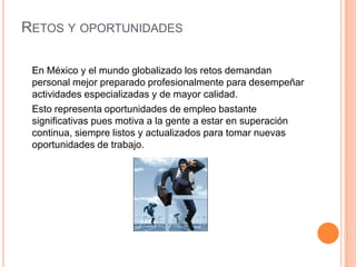 Este documento discute varios retos y oportunidades en recursos humanos en el contexto de la globalización, incluyendo la necesidad de personal mejor capacitado, la importancia de la planeación, adaptarse a nuevas leyes, estilos de vida cambiantes, distribución equitativa de salarios, la capacitación del personal, y la gestión de nuevos puestos en las organizaciones.