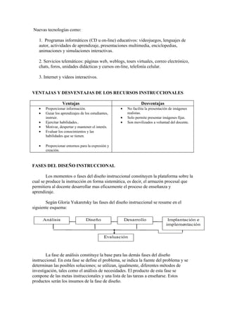 Este documento describe los recursos instruccionales y sus tipos. Explica que los recursos instruccionales son materiales o equipos utilizados por los facilitadores para apoyar el proceso de enseñanza y aprendizaje. Entre los recursos más comunes se encuentran el retroproyector, diapositivas, pizarras y nuevas tecnologías como computadoras e Internet. También describe las fases del diseño instruccional y la importancia de los métodos y recursos en el proceso de enseñanza.