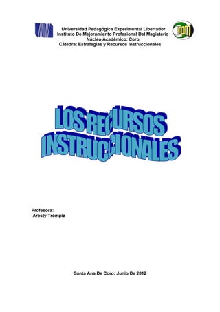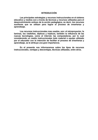 Este documento describe diferentes estrategias y recursos instruccionales utilizados en el sistema educativo. Explica los tipos de recursos como la pizarra, retroproyector, laminas y nuevas tecnologías. También describe las fases del diseño instruccional como análisis, diseño, desarrollo, implementación y evaluación. Finalmente, discute la importancia de los métodos y técnicas de enseñanza en el proceso educativo.