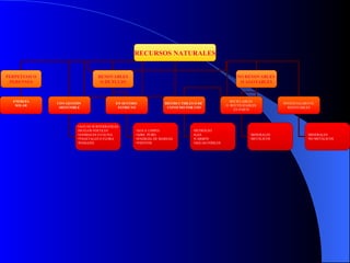El documento clasifica los recursos naturales en renovables y no renovables, y proporciona ejemplos de cada categoría. Los recursos renovables incluyen la energía solar, el agua, el aire y los vientos, mientras que los no renovables como el petróleo, el gas natural y el carbón son agotables con el uso. Además, identifica fuentes como el Atlas del Diario Clarín, Wikipedia y investigaciones de la Cátedra para clasificar y ubicar los recursos naturales del mundo.