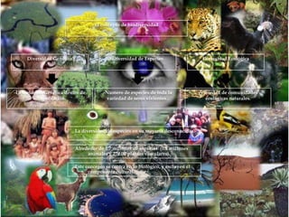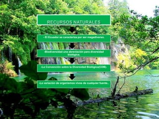 El Ecuador es uno de los países más megadiversos del mundo, albergando gran cantidad de especies de plantas y animales. Debido a factores como la cordillera de los Andes, las altas precipitaciones y la uniformidad de temperatura, el país contiene el 10.7% de los vertebrados del planeta a pesar de tener solo el 0.19% de la superficie terrestre. La biodiversidad ecuatoriana incluye ecosistemas como el páramo, bosques andinos y húmedos, y el archipiélago de Galápagos, y