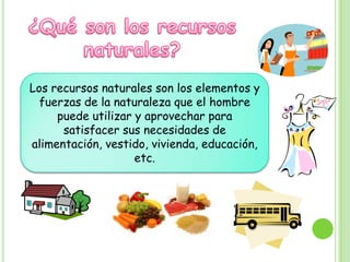 Los recursos naturales son elementos y fuerzas de la naturaleza que el hombre puede utilizar para satisfacer sus necesidades básicas. Los recursos naturales son la fuente de materia prima como madera, minerales y petróleo que se transforman para producir bienes y servicios. La mejor utilización de los recursos naturales depende del conocimiento sobre ellos y de las leyes de conservación.