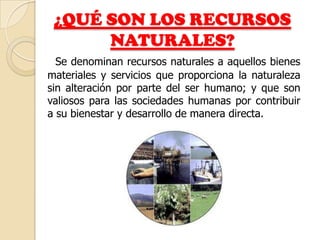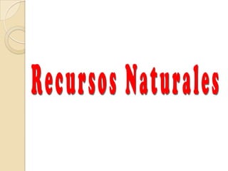 El documento clasifica los recursos naturales en renovables y no renovables, bióticos y abióticos, reutilizables y no reutilizables. También describe recursos culturales como arqueológicos, históricos y antropológicos. Proporciona ejemplos para cada categoría.