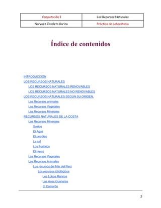 Este documento describe los diferentes tipos de recursos naturales de Perú, incluyendo recursos renovables como plantas y animales, y no renovables como petróleo y minerales. Explica que los recursos renovables como bosques y peces pueden mantenerse si se los cuida adecuadamente, mientras que los no renovables como el petróleo eventualmente se agotarán. Además, detalla los diversos recursos naturales de la costa peruana, incluyendo minerales como el hierro y la sal, vegetación como los manglares, y vida silvest