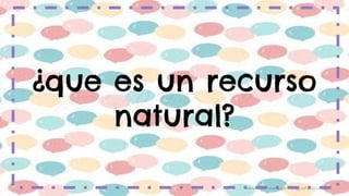 Este documento describe los diferentes tipos de recursos naturales, dividiéndolos en renovables y no renovables. Los recursos renovables como los árboles y peces pueden regenerarse, mientras que los no renovables como los minerales y el petróleo no pueden regenerarse a corto plazo. También discute la importancia de usar los recursos de manera sostenible para preservarlos para las generaciones futuras.
