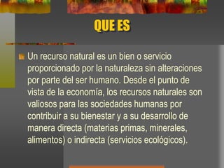 El documento describe los diferentes tipos de recursos naturales, incluyendo renovables, no renovables e inagotables. Explica que los recursos naturales son valiosos para el desarrollo humano y la economía. También cubre temas como la extracción, agotamiento y protección de los recursos naturales.