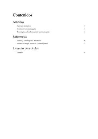 Este documento proporciona información sobre recursos para la enseñanza. Explica conceptos como materiales didácticos, constructivismo y tecnologías de la información y la comunicación. Define materiales didácticos y clasifica su función y tipos. Describe el constructivismo como una corriente pedagógica basada en la teoría del aprendizaje constructivista. Finalmente, explica el significado y evolución histórica de las tecnologías de la información y la comunicación.