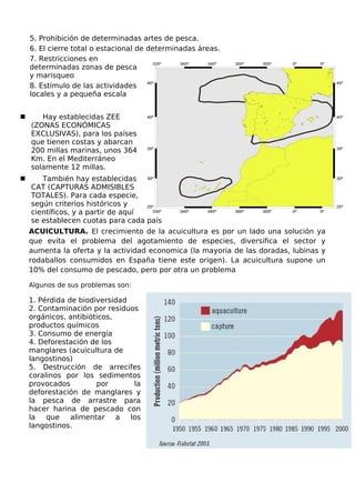 Este documento describe los recursos pesqueros globales. Señala que la pesca proporciona casi el 20% de la proteína animal consumida y proviene principalmente del mar, aguas dulces y acuicultura. Sin embargo, muchas poblaciones de peces están sobreexplotadas y en peligro de agotamiento debido a la pesca excesiva. Se necesitan medidas como limitar el número de barcos y redes, establecer cuotas de captura y cerrar áreas para proteger los ecosistemas marinos y la sustentabilidad a largo pl