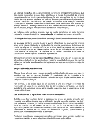 El documento habla sobre los recursos renovables y no renovables. Define los recursos renovables como aquellos cuya existencia no se agota con su uso debido a que se regeneran, como el agua, la biomasa, la energía hidroeléctrica y eólica. Los no renovables como el petróleo y los minerales existen en cantidades fijas. También discute sobre el agua, la biomasa y los productos agrícolas como recursos renovables, así como la energía hidráulica, solar y eólica. Finalmente, analiza