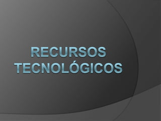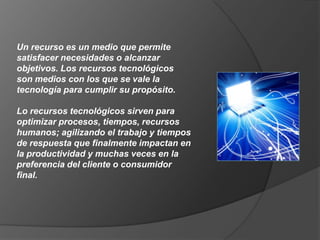 Este documento describe los recursos tecnológicos como medios que permiten a la tecnología cumplir su propósito de optimizar procesos, tiempos y recursos humanos para agilizar el trabajo y mejorar la productividad y preferencia del cliente. Explica que los recursos tecnológicos como computadoras modernas, internet de alta velocidad, redes informáticas y teléfonos inteligentes son ahora una parte imprescindible de las empresas y hogares ya que permiten a las empresas competir con éxito en el mercado más allá de sus pro