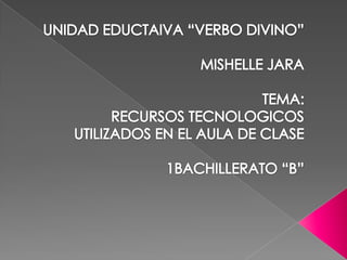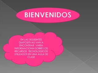 El documento describe los recursos tecnológicos utilizados en un aula de clase, incluyendo proyectores para proyectar la pantalla del ordenador en una pizarra, pizarras digitales interactivas que permiten interactuar directamente con lápices, e interruptores para conectar dispositivos como proyectores.