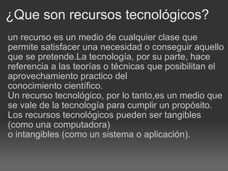 El documento habla sobre diferentes recursos tecnológicos como computadoras, sistemas, aplicaciones y redes de información que pueden usarse para presentaciones, comunicación, documentación y estar actualizado. También menciona varios dispositivos como tabletas, teléfonos y televisores de empresas como Dell, Samsung, Motorola y más, destacando sus características y sistemas operativos. Finalmente, concluye que la tecnología avanza rápidamente y que en el futuro podríamos conectarnos de maneras aún más inalámbricas e incluso