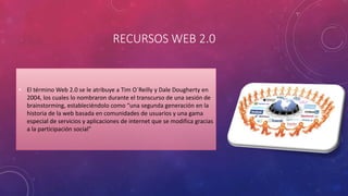 El documento explora el concepto de web 2.0 y sus aplicaciones en el ámbito educativo, destacando características como la interactividad, conectividad y colaboración. Se presentan diversos recursos como redes sociales, wikis, blogs y herramientas de comunicación, junto con sus aplicaciones didácticas para fomentar el aprendizaje. Se enfatiza la importancia de la accesibilidad y el uso de tecnologías móviles en el entorno educativo.