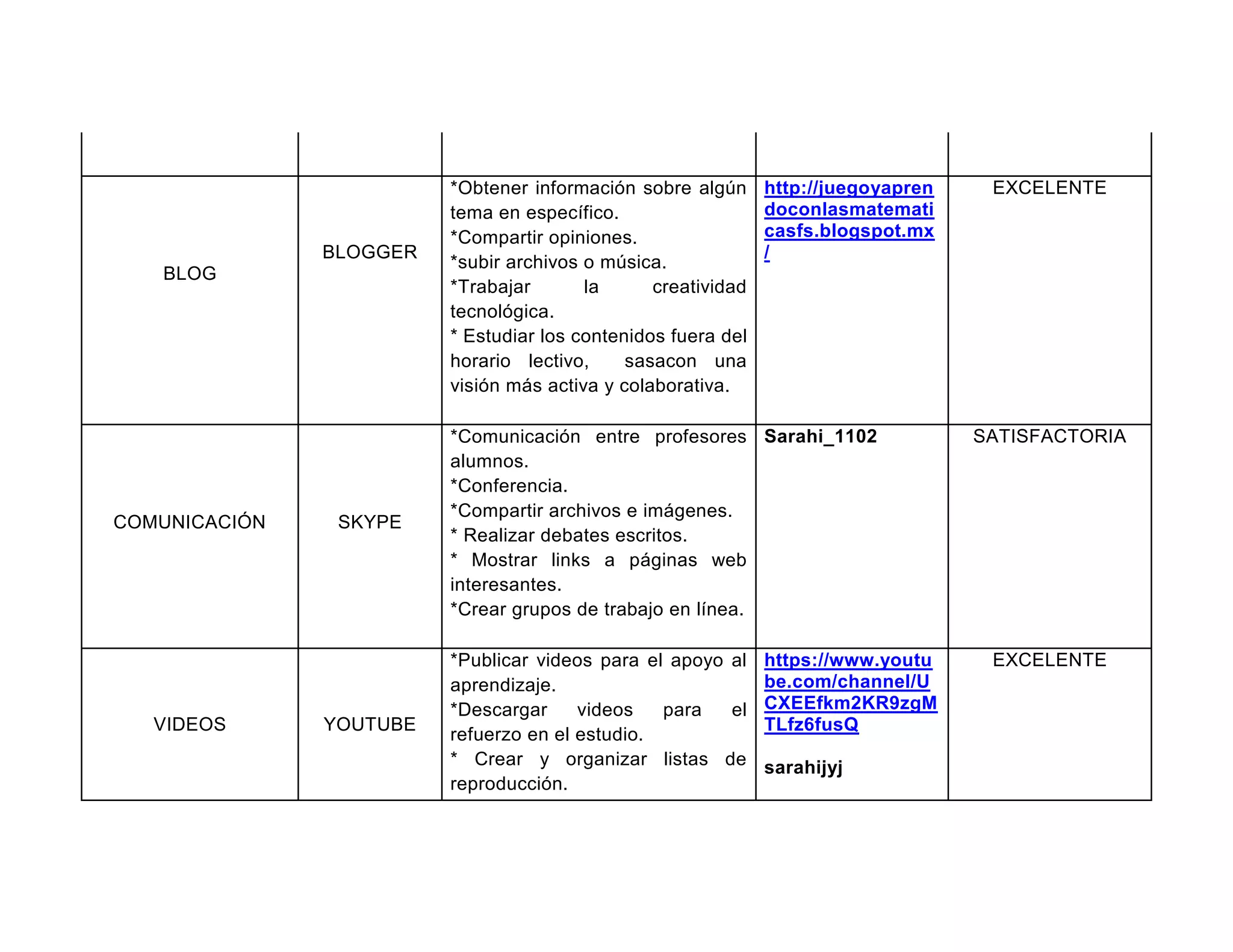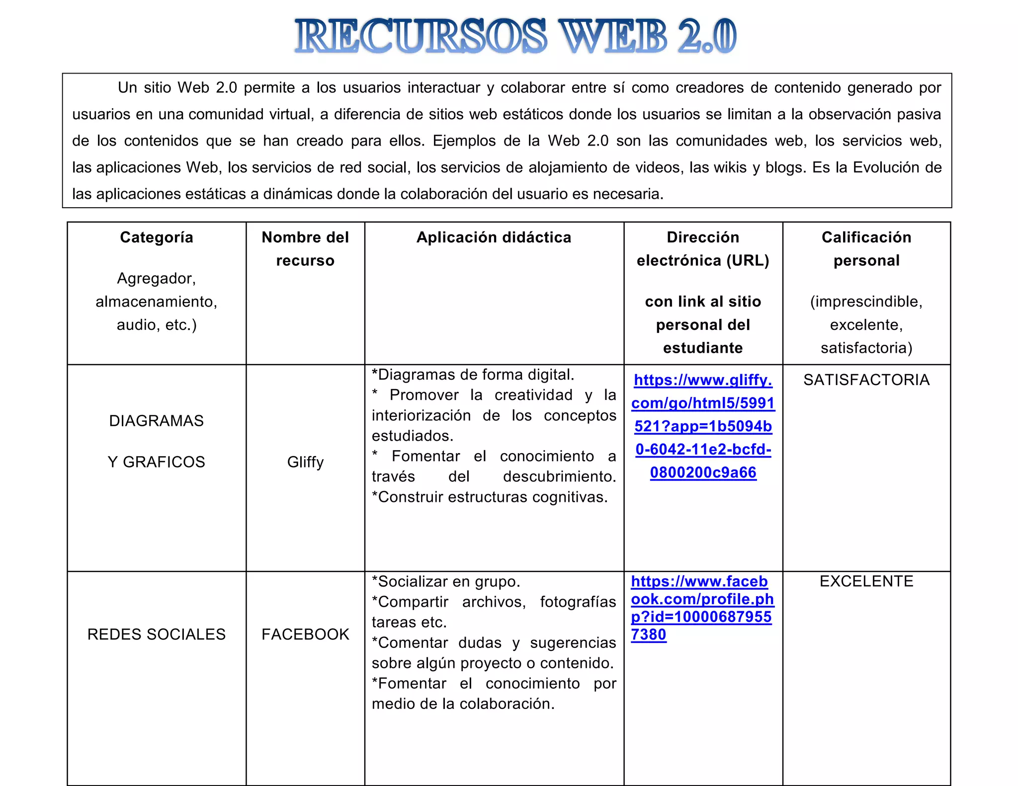 El documento describe varios recursos web como Gliffy, Facebook, Blogger, Skype, YouTube, Wiki Spaces, SlideShare y Dropbox, y cómo se pueden usar para fines educativos. Estos recursos permiten diagramas digitales, comunicación social, compartir archivos y opiniones, publicar y descargar videos, crear wikis colaborativas, compartir presentaciones y almacenar archivos en la nube. El documento concluye que estos recursos permiten la comunicación y colaboración entre estudiantes, maestros y padres, y pueden mejorar el aprendiz