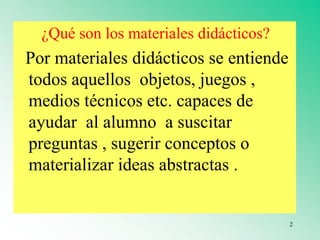 El documento presenta varios materiales didácticos para la enseñanza de las matemáticas, como palillos, el ábaco, tablas de multiplicar, geoplanos, regletas Cuisenaire, dominós y policubos. Describe las actividades que se pueden realizar con cada material para cubrir temas de números, geometría, medida y probabilidad de manera lúdica y práctica.