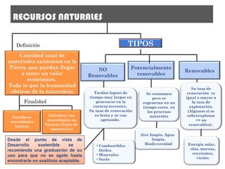 Este documento proporciona información sobre los recursos energéticos y su impacto. Explica que los combustibles fósiles como el carbón, el petróleo y el gas natural, aunque proveen actualmente la mayor parte de la energía mundial, son recursos no renovables que eventualmente se agotarán. También causan contaminación y contribuyen al cambio climático. Por lo tanto, es necesario desarrollar energías alternativas renovables y minimizar el impacto de los combustibles fósiles.