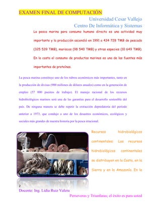 El documento describe los recursos hidrobiológicos de Perú, incluyendo una variedad de 1000 especies marinas y recursos continentales importantes. Los recursos hidrobiológicos marinos y continentales son valiosos económicamente y para la nutrición, y la pesca es una de las industrias más importantes de Perú. Sin embargo, la extracción excesiva ha causado daños en el pasado, por lo que el manejo sostenible de los recursos es fundamental para el desarrollo futuro del país.