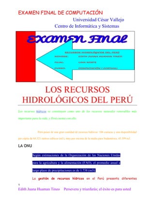 Perú posee grandes recursos hídricos renovables, con 106 cuencas que abastecen una disponibilidad per cápita superior al promedio sudamericano. Tradicionalmente, el gobierno se ha enfocado en desarrollar infraestructura como presas y canales de irrigación, especialmente en la costa, para satisfacer la creciente demanda de agua de los sectores agrícola y doméstico. Actualmente, el gobierno busca transformar la gestión de los recursos hídricos hacia un enfoque más integral e involucrar a