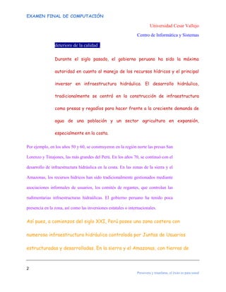 El documento describe la gestión de los recursos hídricos en el Perú, señalando que posee abundantes recursos pero enfrenta desafíos como la contaminación y falta de capacidad institucional. Históricamente, el gobierno se ha enfocado en el desarrollo de infraestructura para la costa, pero ahora busca un enfoque integrado que incluya a toda el país. Además, está promoviendo reformas para mejorar el marco legal e institucional de la gestión del agua.