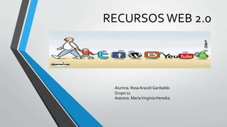 Este documento presenta 7 categorías de recursos web 2.0 y sus aplicaciones didácticas. Incluye blogs para estimular la creatividad de los estudiantes, buscadores como Google para encontrar documentos académicos, redes sociales como Facebook para compartir aplicaciones y trabajos en grupo, YouTube para ampliar conocimientos más allá del entretenimiento, PowerPoint para presentaciones atractivas, wikis para colaborar en proyectos, y microblogs como Edumodo para comunicación entre clases. Los recursos se califican como satisfactorios a excelentes para fines educativos