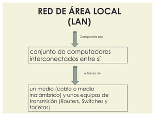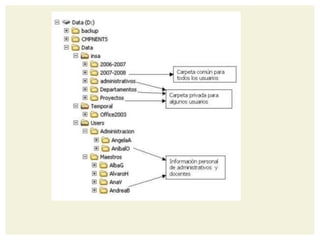 La red escolar de datos permite compartir recursos e información entre usuarios de una institución educativa de forma rápida y fácil. Se compone de dos servidores interconectados, uno para estudiantes y otro para el personal administrativo, con políticas de seguridad que restringen el acceso de estudiantes al servidor administrativo. La red requiere implementar medidas como antivirus actualizados y políticas de acceso a internet para proteger la información compartida.