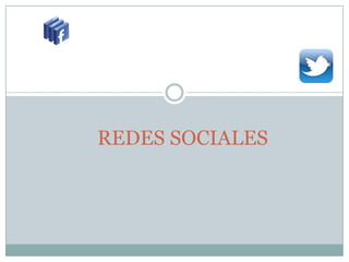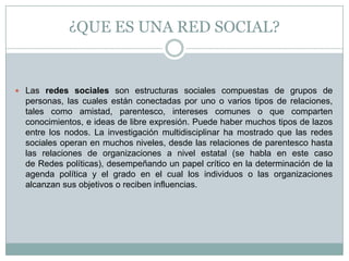 Este documento describe las redes sociales y algunas de las principales redes sociales existentes. Define una red social como una estructura social compuesta de grupos de personas conectadas por relaciones como amistad, parentesco o intereses comunes. Explica que las principales redes sociales a nivel mundial incluyen Facebook, Twitter, MySpace y otras. Brevemente describe las características clave y funcionalidades de cada una.