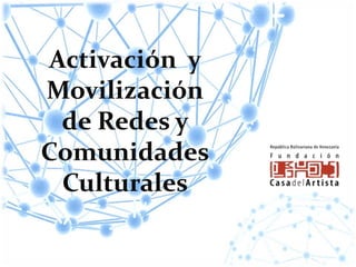El documento describe la importancia de las redes culturales y comités de cultura comunitarios para promover la participación ciudadana y descentralizar la cultura. Explica que las redes culturales permiten una cooperación efectiva entre actores culturales y brindan apoyo a instituciones. Los objetivos son analizar el funcionamiento de las redes culturales, compararlas con los comités de cultura, e implementar políticas culturales participativas que valoren el patrimonio cultural local.