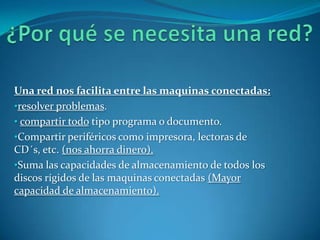 Una red permite compartir recursos como archivos, programas e impresoras entre computadoras conectadas, brindando mayores capacidades de almacenamiento y comunicación. Existen diferentes tipos de redes como las LAN que se limitan a un edificio, las WAN que se extienden a ciudades o países, e Internet que conecta computadoras a nivel mundial. Las redes facilitan resolver problemas de forma colaborativa y centralizar información de forma accesible para todos los usuarios conectados.