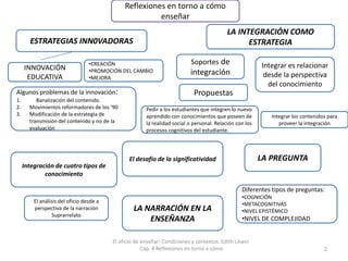Este documento discute varios aspectos clave de la enseñanza. Define la enseñanza como una práctica social regulada que implica la transmisión intencional de contenidos por parte del docente. Explora las características particulares de la acción docente, como ser un mediador entre los estudiantes y el conocimiento. También analiza estrategias para la integración de contenidos, como relacionarlos desde la perspectiva del conocimiento para proveer significatividad a los estudiantes. Finalmente, examina el uso de la narración y preguntas de diferentes