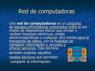 Este documento resume los conceptos básicos de las redes de computadoras, incluyendo su clasificación por alcance, tecnología, grado de difusión y servicios. Explica los tipos de conexión a Internet, como ADSL, cable y satélite, así como servicios populares como la World Wide Web. Finalmente, aborda brevemente los virus informáticos y métodos de protección antivirus.
