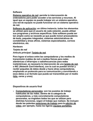 Una red de computadoras interconecta equipos informáticos y software para compartir información y recursos. Requiere de componentes como hardware, software y protocolos. El hardware incluye dispositivos de usuario como computadoras y servidores, así como tarjetas de red e interfaces para conectar los dispositivos. El software gestiona la comunicación entre los nodos de la red. Las redes pueden tener diferentes topologías físicas como bus, anillo, estrella o malla.