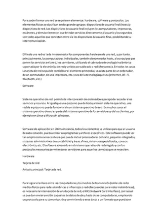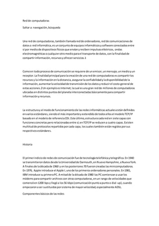 Una red de computadoras es un conjunto de equipos informáticos conectados entre sí para compartir información y recursos. Las redes permiten compartir recursos y datos a distancia, aumentar la velocidad de transmisión y reducir costos. Están compuestas por dispositivos de usuario como computadoras, impresoras y servidores que ofrecen servicios a través de hardware como tarjetas de red, cables y protocolos de comunicación.