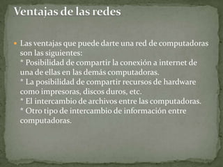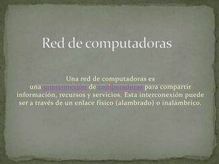 Una red de computadoras permite compartir recursos e información entre dispositivos a través de conexiones físicas o inalámbricas. Las redes se pueden clasificar según su alcance geográfico en LANs para áreas pequeñas, MANs para ciudades, y WANs para regiones más amplias. Dispositivos como concentradores, switches, puentes y enrutadores juegan un papel importante en la interconexión de redes.