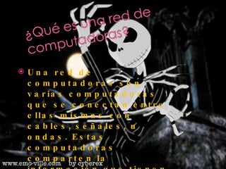 Una red de computadoras conecta varias computadoras entre sí para compartir información a través de cables, señales u ondas. Estas redes permiten el intercambio de datos e información importante entre computadoras sin importar su ubicación física. Existen diferentes tipos de redes como PAN, LAN, MAN y WAN.