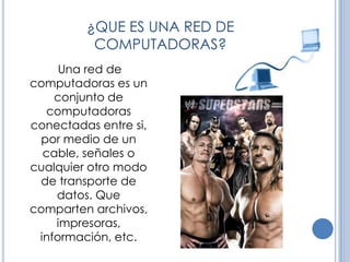 Una red de computadoras es un conjunto de computadoras conectadas entre sí que comparten archivos, impresoras e información. Las redes se utilizan para compartir recursos y datos entre las computadoras conectadas. Existen diferentes tipos de redes clasificadas por su alcance geográfico, como PAN, LAN, MAN y WAN.