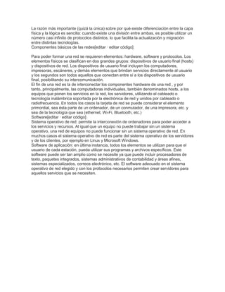 Una red de computadoras conecta equipos informáticos y software a través de dispositivos físicos para compartir información y recursos. Las redes se rigen por estándares como el modelo TCP/IP de 7 capas o el modelo OSI de 4 capas. Las redes incluyen elementos físicos como tarjetas de red y cables, y elementos lógicos como protocolos que permiten la comunicación entre los equipos.