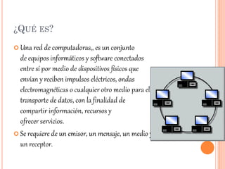 El documento describe una red de computadoras formada por 6 integrantes y explica brevemente qué es una red de computadoras, su finalidad principal de compartir recursos e información, y los elementos clave que la componen como hardware, software, tarjetas de interfaz y cables.
