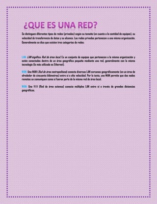 Una red de computadoras conecta equipos informáticos mediante dispositivos físicos que transmiten datos. Existen diferentes tipos de redes privadas según su tamaño, velocidad y alcance, incluyendo LAN (redes de área local), MAN (redes metropolitanas) y WAN (redes de área extensa). La topología de red define la forma en que los nodos de una red se comunican para intercambiar datos.